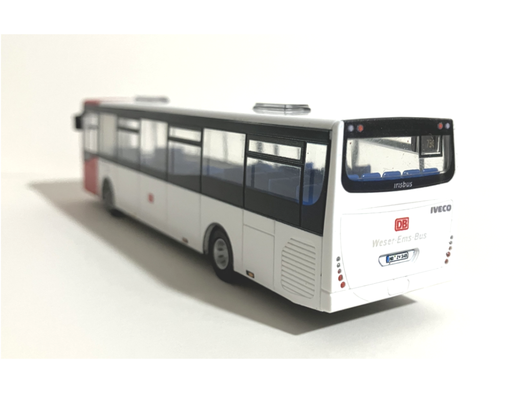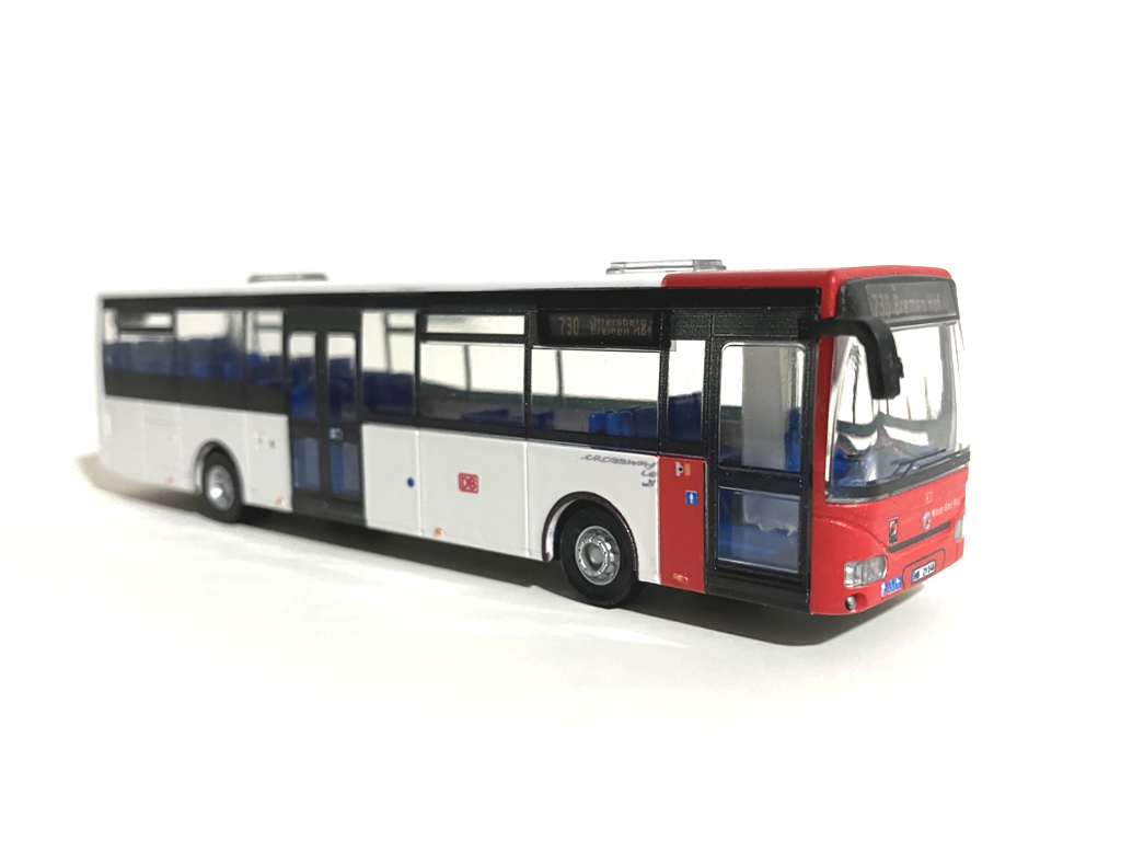 Plastikový model autobusu Irisbus Crossway LE vyrobený firmou KSM Modelle v měřítku 1:87. Model v kvalitním zpracování má gumové pneumatiky, z výroby profesionálně instalovaná zrcátka, autentickou linku a SPZ a lakované disky kol pro realističtější vzhled. Autobus představuje další modifikaci nátěru ze série autobusů Deutsche Bahn (DB).